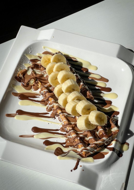 Gaufre garnie de biscuit Oreo, de banane et de trois types de chocolat belge (lait, noir et blanc), accompagnée d'une boule de glace.